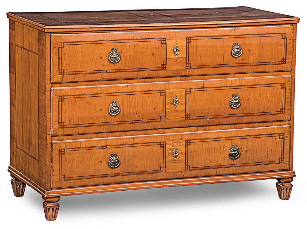 magyar, 19. sz. eleje, fenyőfa alapon cseresznyefa borítással, paliszander intarziával, faragott lábakon, öntött bronz veretekkel, eredeti zárszerkezettel, 3 db kulccsal, kis sérülésekkel, 90*129*62 cm