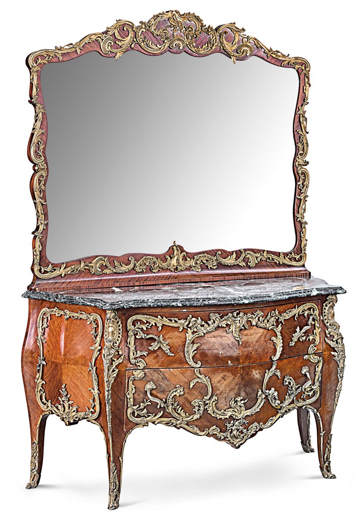 osztrák, 19. sz., tölgyfa alapon mahagóni borítással, aranyozott bronz veretekkel, komód tetején profilált márványlappal, komód: 90*156*69 cm; tükör: 129*147 cm