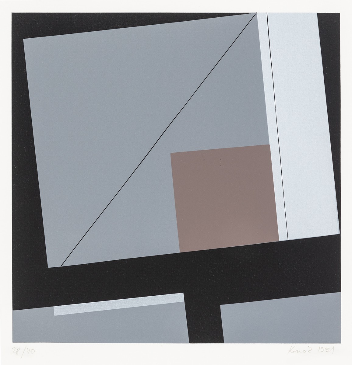 Konok Tamás (Budapest, 1930 – Budapest, 2020) S.T., 1991 Szitanyomat, papír 278 × 278 mm Jelezve balra lent: 28/40 Jelezve jobbra lent: Konok 1991 Lap a Konok Tamás-mappából (6 lap). Budapest, Vasarely Múzeum, 1991. Oeuvre-jegyzék: 1991/142/6
