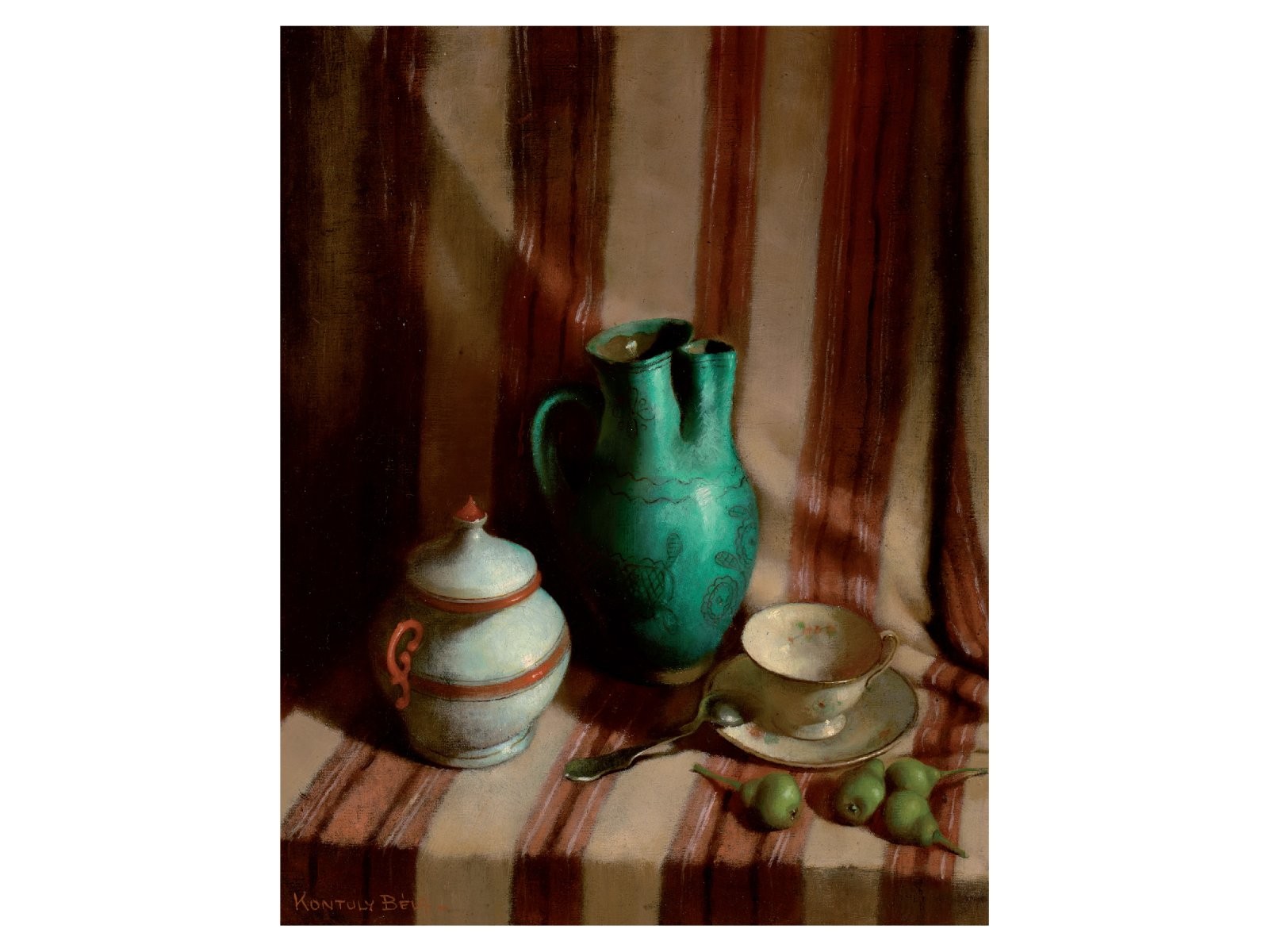 Kontuly Béla (Miskolc, 1904 – Budapest, 1983) Csendélet csíkos drapérián Olaj, vászon 68 X 54,5 cm Jelezve balra lent: Kontuly Béla