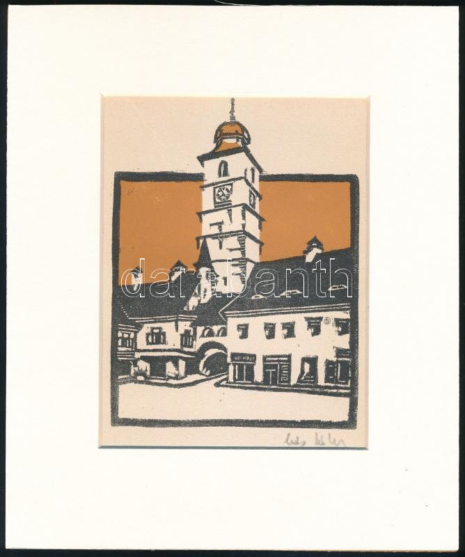 Kós Károly (1883-1977): Nagyszebeni várostorony. Linómetszet, papír, utólagos jelzéssel, paszpartuban, 15,5×12 cm<a href="https://www.darabanth.com/hu/gyorsarveres/430/kategoriak~Festmenyek-es-grafikak/Festmenyek-es-grafikak-jelzessel-jelzes-nelkul~