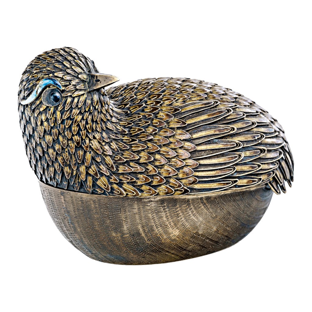 orosz (?), 1900 körül, 2016 utáni budapesti fémjellel ellátva, belül aranyozott 925 ezrelékes ezüst, "S013" bélyegzővel, madár test plasztikus tollazata színes rekeszzománccal fedve,, szemeiben gránát színű üveg, kis sérüléssel, 243 g; 8*11*7,5 cm,