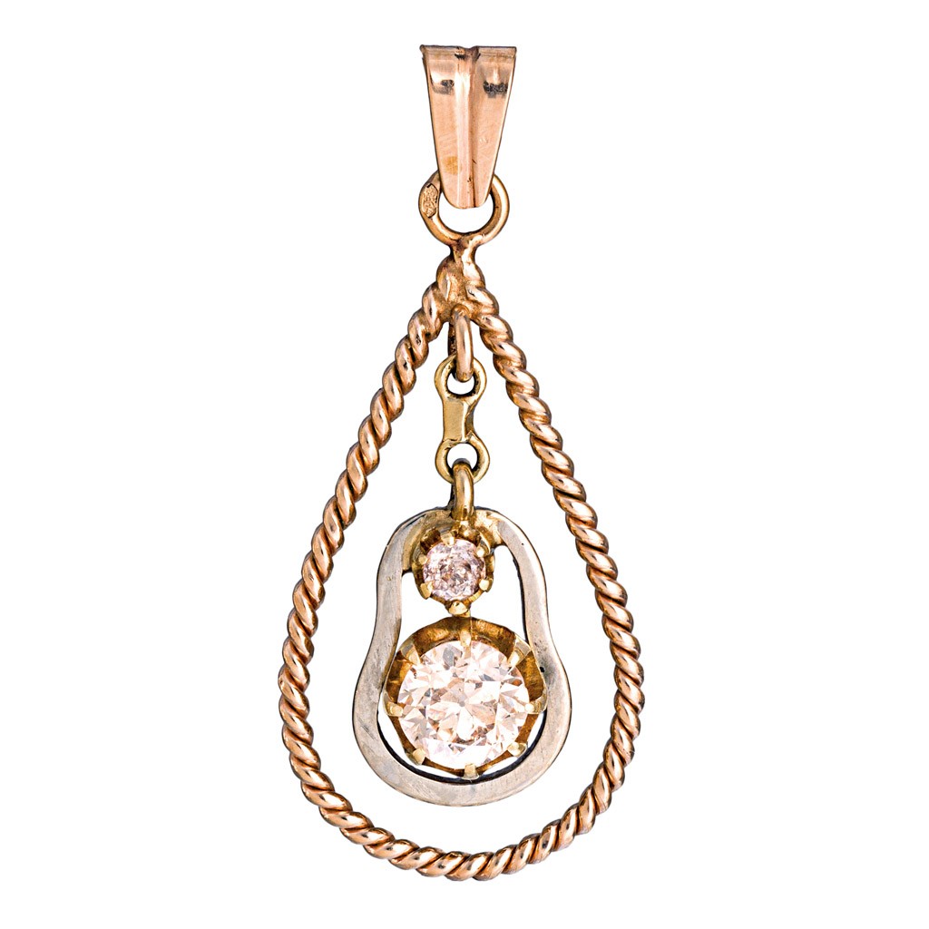 20. sz. második fele, 1966 utáni behozatali fémjel, 14 k arany, csepp alakú keret, csüngőben 1 db cca. 0,7 ct briliáns (M2, LB, SI2) és 1 db apró cca. 0,07 ct gyémánt, 3,4 g; h: 3,5 cm