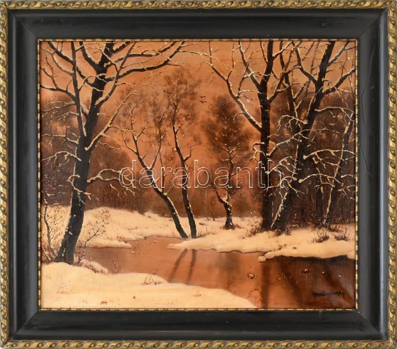 Mednyánszky jelzéssel: Téli táj. Olaj, vászon. Dekoratív, kissé sérült fa keretben. 50×60 cm<a href="https://www.darabanth.com/hu/gyorsarveres/435/kategoriak~Festmenyek-es-grafikak/Festmenyek-es-grafikak-jelzessel-jelzes-nelkul~500002/Mednyanszky-je