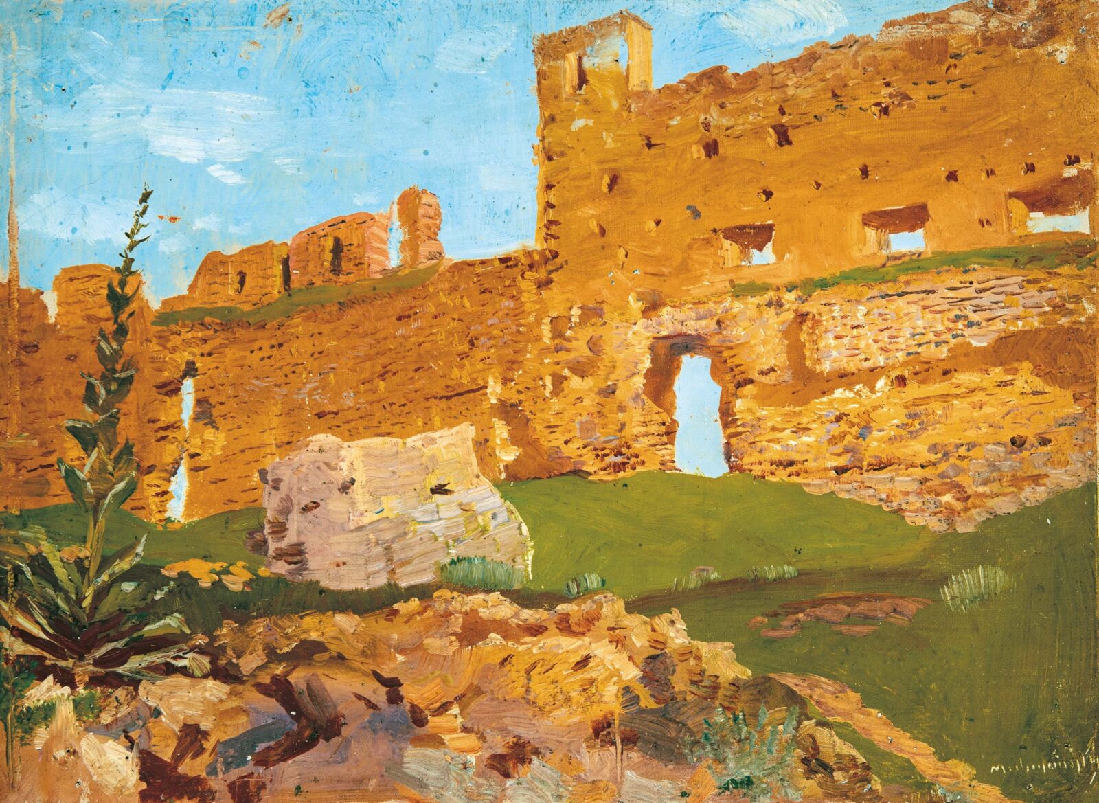 Olaj, papírlemez, 27,5 x 38 cm, Jelezve jobbra lent: Mednyánszky, Hátoldalon: Mednyánszky 1919 hagyatéki pecsét: Mednyánszky 1919, Hátoldalon autográf felirat: Beckói romok