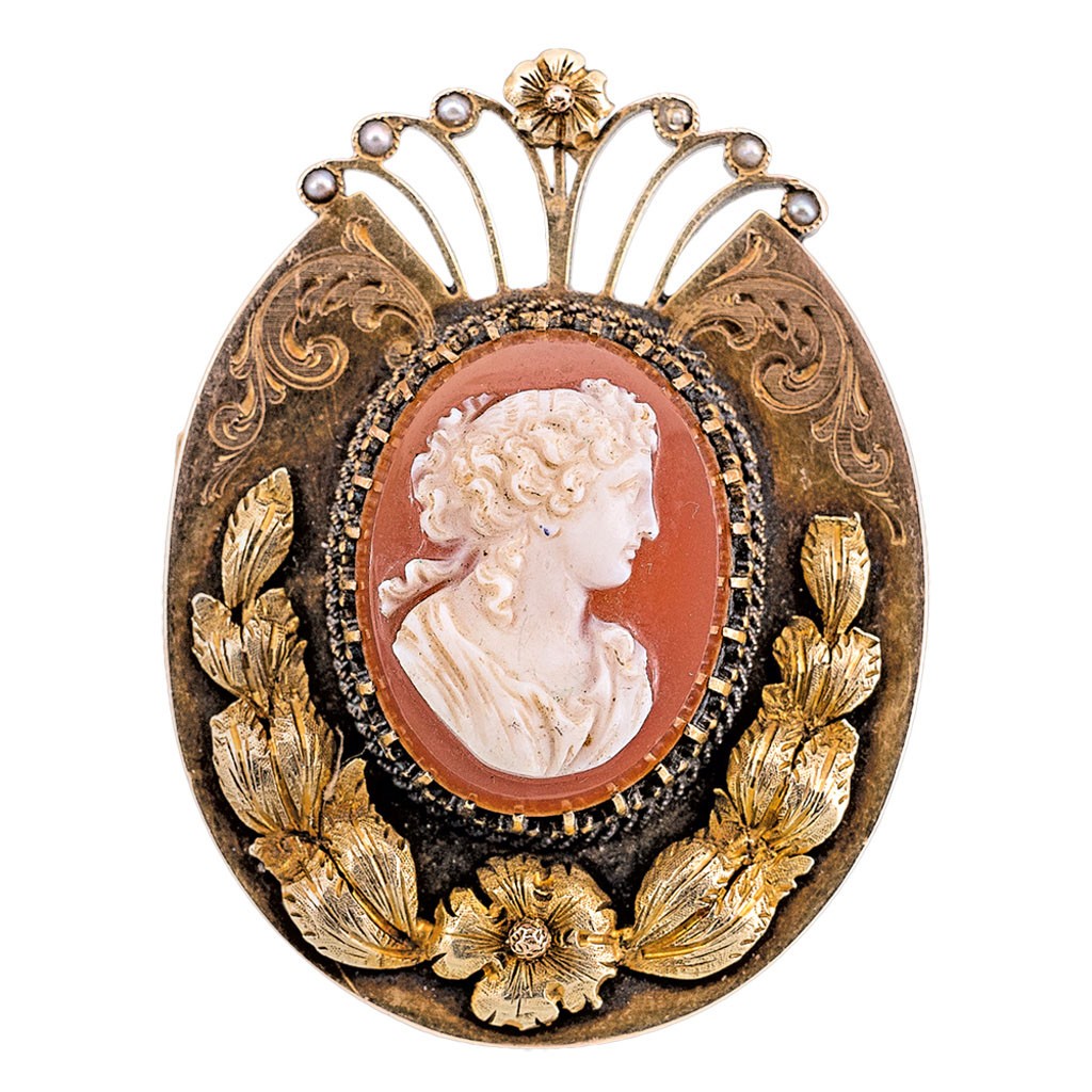 19. sz. második fele, antik arany, fém tűvel, faragott lágenkő kámea női portréval, plasztikus és vésett indával és apró gyöngyökkel díszítve, Btto.: 15,8 g; 4,5*3,3 cm