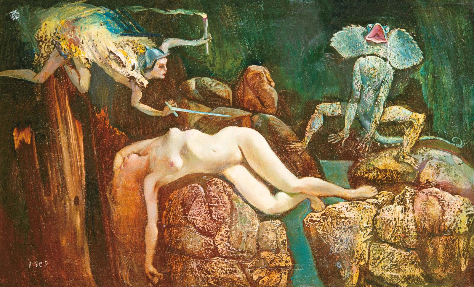 Olaj, vászon, 59,5 x 100 cm, Jelezve balra lent: MCP, Jelezve hátoldalon: Perseus & Androdéma MCP 1969