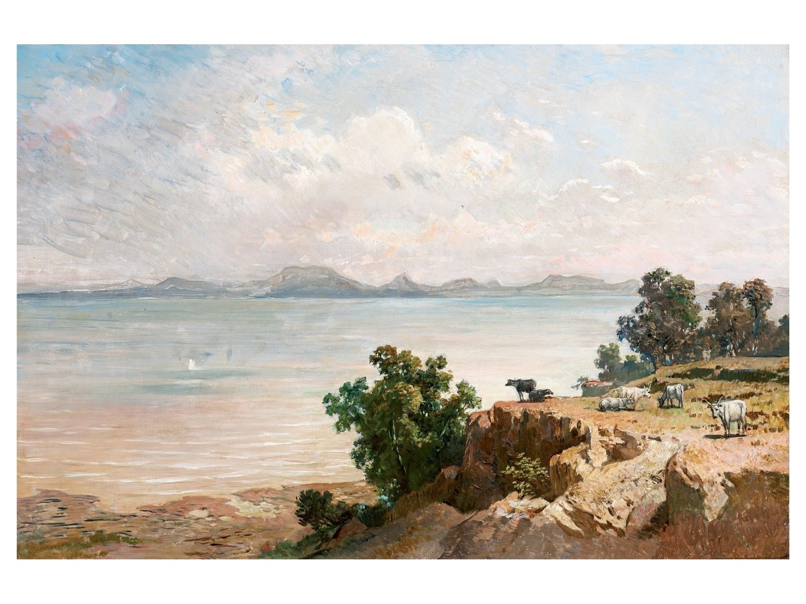 Kikiáltási ár: 95 000 FtÓvári László (Nyíregyháza, 1926 – Budapest, 1988) Balatoni táj Olaj, vászon 60 × 90 cm Jelezve balra lent: Óvári Hátoldalán Képcsarnoki etikett