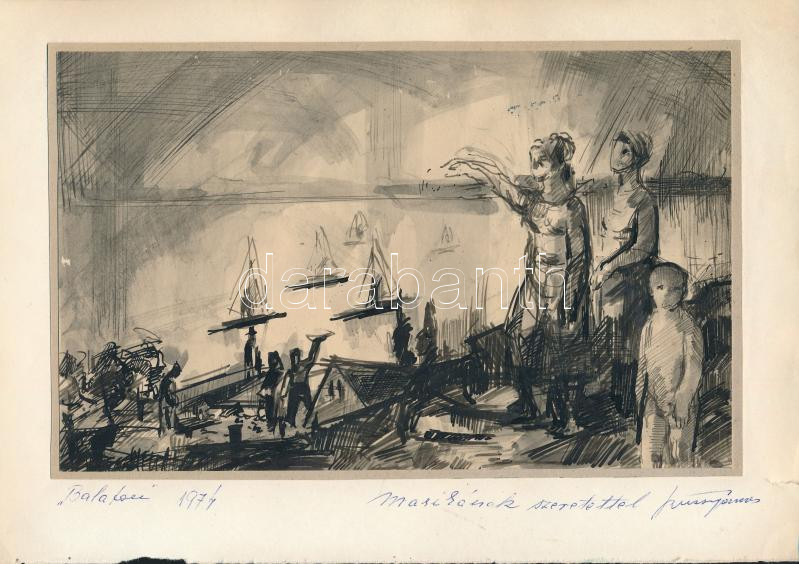 Olvashatatlan jelzéssel: Balaton vitorlásokkal és kirándulókkal, 1974. Tus, papír. Jelzett. Papírra kasírozva. 15×25 cm.<a href="https://www.darabanth.com/hu/gyorsarveres/436/kategoriak~Festmenyek-es-grafikak/Festmenyek-es-grafikak-jelzessel-jelzes-