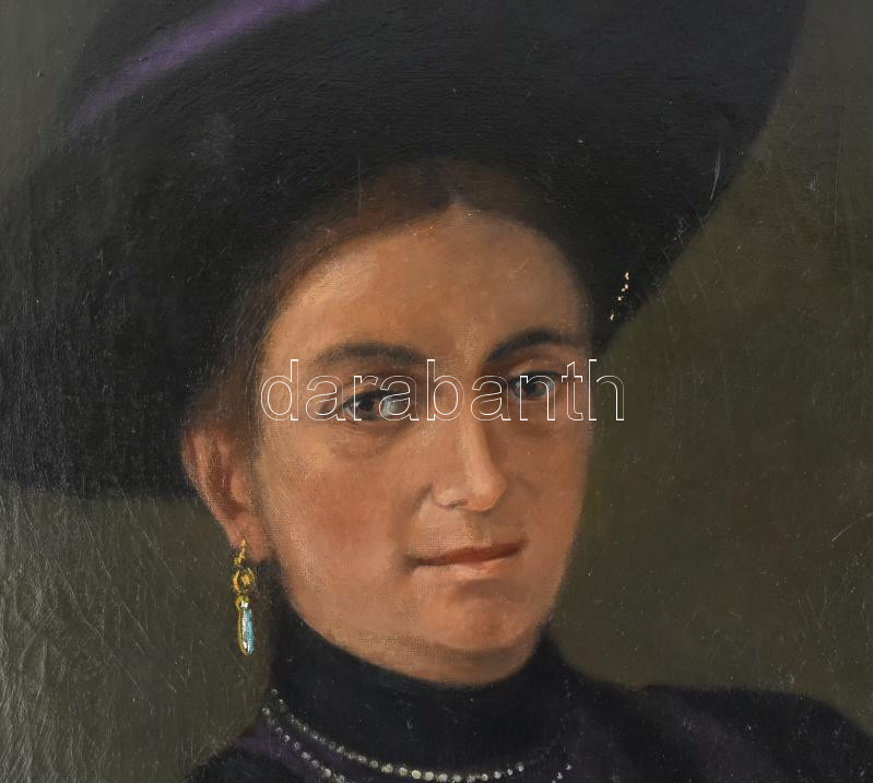 Olvashatatlan jelzéssel (jobbra fent), XX. sz. eleje: Kalapos hölgy portréja. Olaj, vászon. Javított. Kissé sérült. Dekoratív, kissé sérült fakeretben. 100×75 cm. KIZÁRÓLAG SZEMÉLYES ÁTVÉTEL, NEM POSTÁZZUK! / ONLY PERSONAL