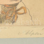 10210. tétel:Michel Fingesten (1884-1943): Ex libris Delage ( morbid, halálos szerelmet imitáló Ex libris a művész saját kezű aláírásával). Opus 1143. (1940 körül) Rézkarc, papír, jelezve jobbra lent, 132x88 mm. A csehországi születésű Michl Finkelstein (1884-1943) grafikusművész 1900-tól a bécsi Kunstakademie-ben tanult, Oskar Kokoschka társaságában. Félbehagyott tanulmányait Münchenben folytatta, majd 1913-tól Berlinben tanulta ki a rézmetszés fortélyait. A Michel Fingesten művésznevet felvevő grafikus az első világháború után a német némafilmes és illusztrátori világban dolgozott. A művészetét betiltó új német rezsim nyomása elől Milánóba költözött, ott fordult érdeklődése a kisgrafikák felé. Ex librisként feliratozott grafikái számos esetben a képzeletbeli megrendelő tulajdonságait növelik szürreális, művészi látomássá. Rézkarcunk ezúttal viszont feltehetően valós megrendelő, Albert Delage francia könyvgyűjtő számára készült. A morbid, szürreális grafika középpontjában földbe ásott, tövisekkel körbevett női fejet csókoló férfi arc kontúrjai sejlenek fel, a csókjelenet körül kaján örömmel vigyorgó emberi koponya, alul androgün, haláli harsonások veszik körbe az Ex libris feliratot, felül pedig Paul Verlaine francia költő korai verséből való idézet. A grafika alatt Michel Fingesten saját kezű aláírása. Tökéletes állapotú lap, paszpartuban, fakeretben, üveglap mögött.