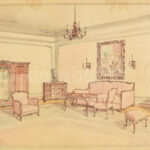 Olvashatatlan (Szmrecsányi?) jelzéssel, 1900-1910 körül: 3 db enteriőrterv bútorokkal, szőnyegekkel, festményekkel, csillárokkal. Akvarell, papír, sérült, részben javított, feltekerve, 33×50,5 cm.