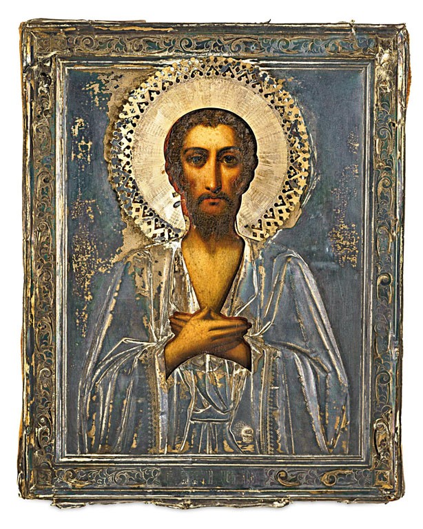 olaj, fa, ezüstoklád, 22,5*17,5 cm, ezüst rizával: Moszkva, 1908-17 közötti 84 zlotnyikos finomsági jel, aranyozott ezüst dicsfény sérült