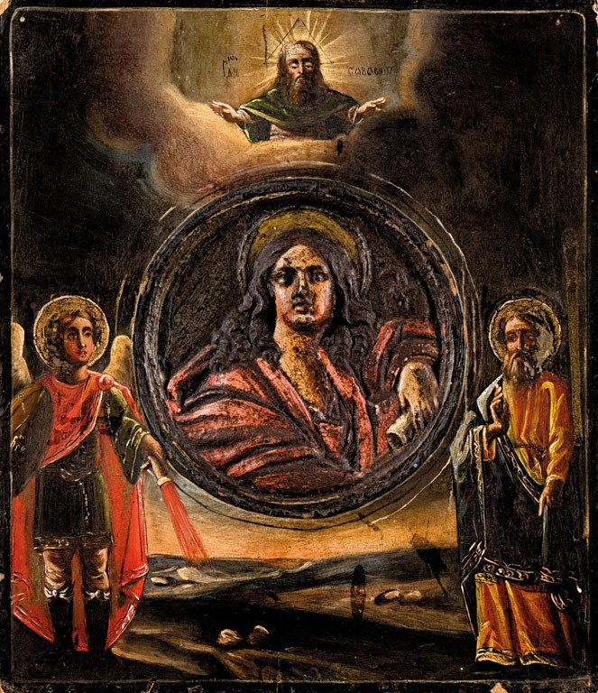 Orosz ikonfestő, 19. sz. vége: Szent Mihály arkangyal és Szent Teodor medalionban Hitvalló Pál alakjával
