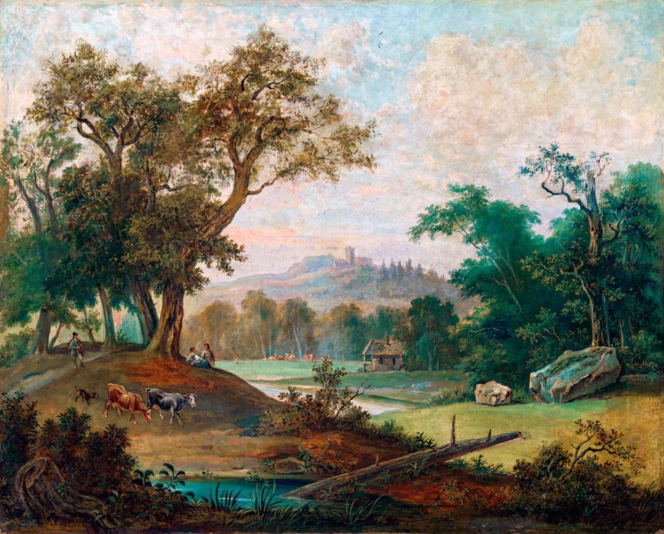 Osztrák festő, 19. sz. közepe: Sziklás táj pihenő pásztorokkal