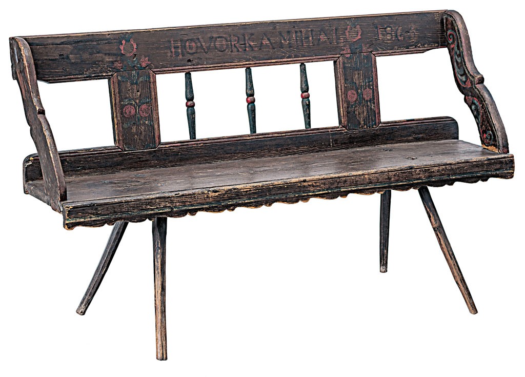 Hódmezővásárhely, 1865, festett, faragott fenyőfa, "Hovorka Mihal 1865" felirattal, 90,5*157*37 cm