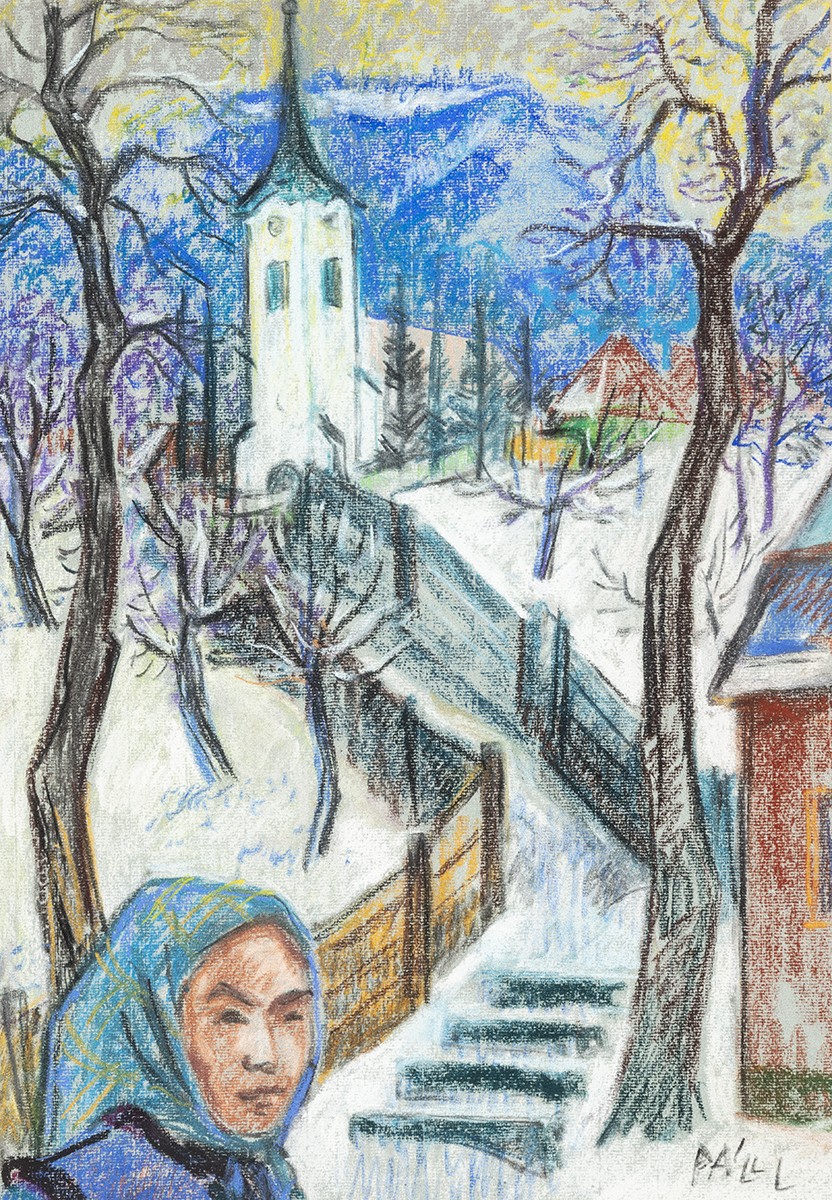 Páll Lajos (Korond, 1938 – Székelyudvarhely, 2012) Korond télen Pasztell, papír 50 × 35 cm Jelezve jobbra lent: Páll L.
