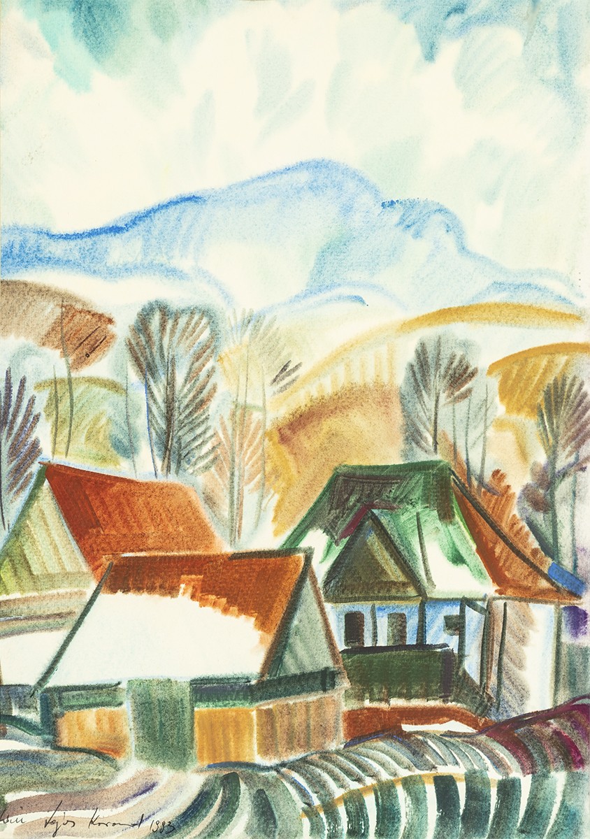 Páll Lajos (Korond, 1938 – Székelyudvarhely, 2012) Korondi házak, 1993 Pasztell, akvarell, papír 480 × 340 mm Jelezve balra lent: Páll Lajos Korond 1993