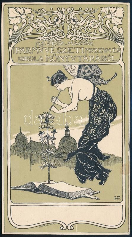 Pap Henrik (1864-1910) – Morelli Gusztáv (1848-1909): Az Országos Magyar Iparművészeti Múzeum és Iskola Könyvtárából, szecessziós, fametszetű ex libris, jelzett a nyomaton, kis folttal, 16,5×9 cm