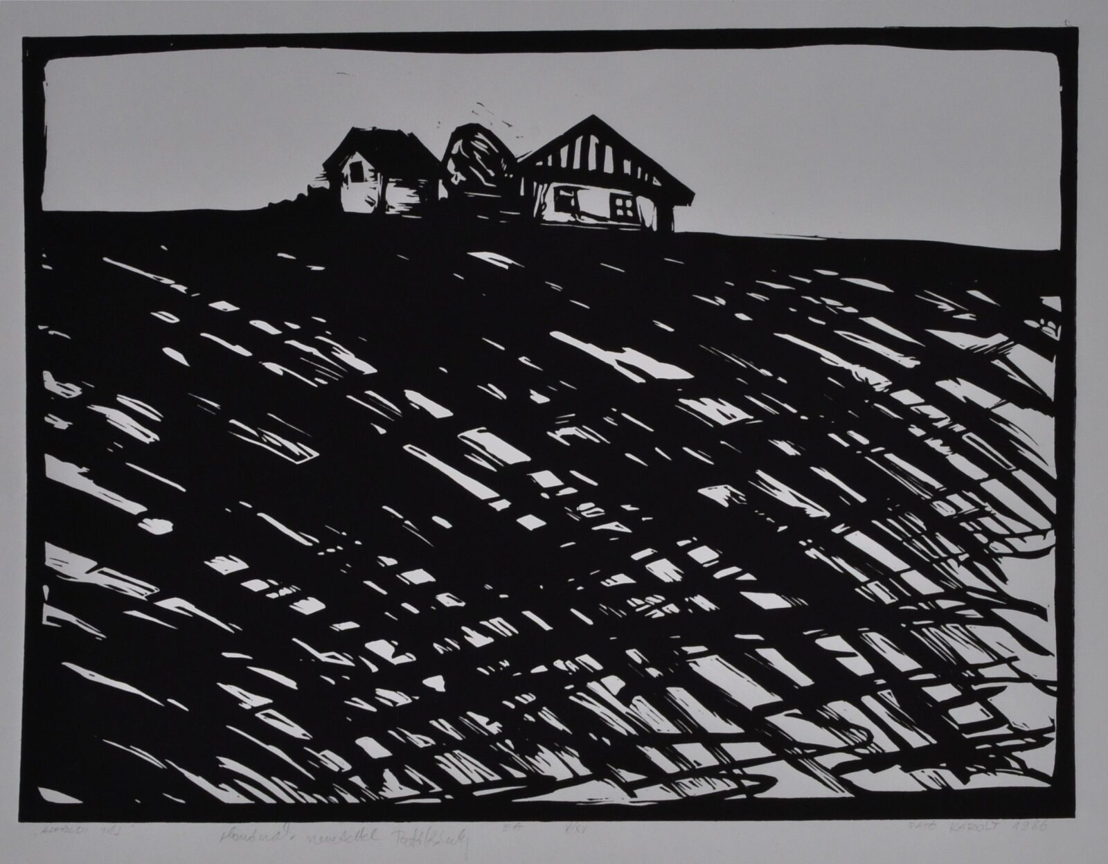 Linómetszet, papír, 27 x 37 cm, Jelezve jobbra lent: Pató Károly 1986