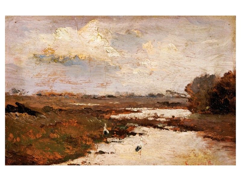 Pest, 1852– Budapest, 1914 Mocsaras táj gólyákkal Olaj, karton