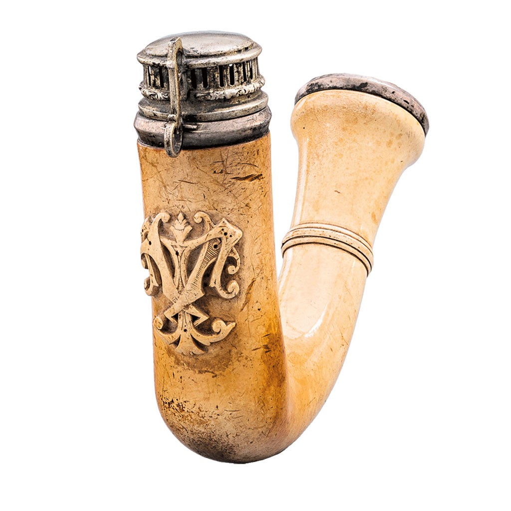 Adler Henrik műhelye, 19. sz. vége, faragott tajtékkő, fém szerelékkel, Adler jelzettel, gyümölcsfa szárral, h: 10 cm; szár: 56 cm