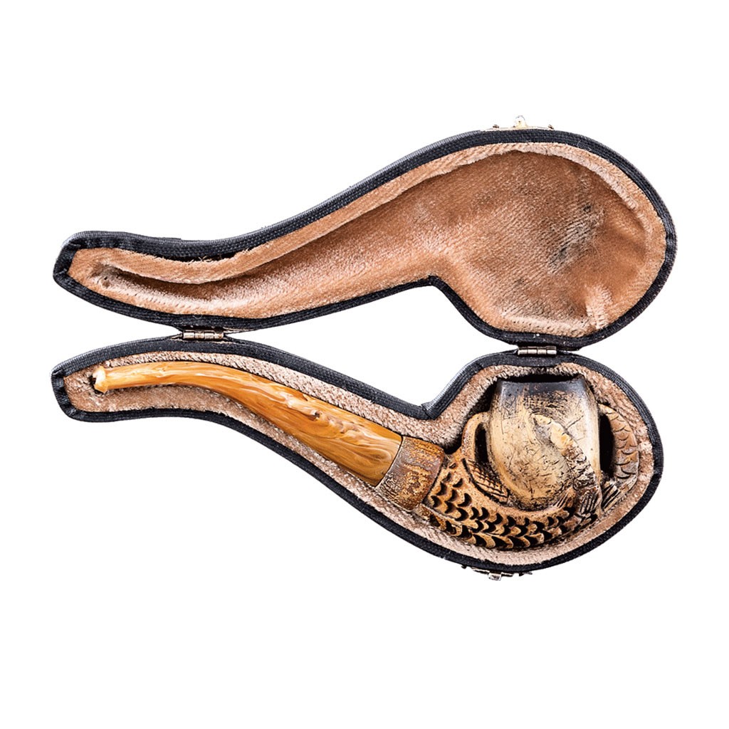 19. sz., faragott tajtékkő sas karom díszítéssel, szára 20. századi pótlás műanyagból, PAKTAS jelzettel, eredeti tokjában, h: 14 cm