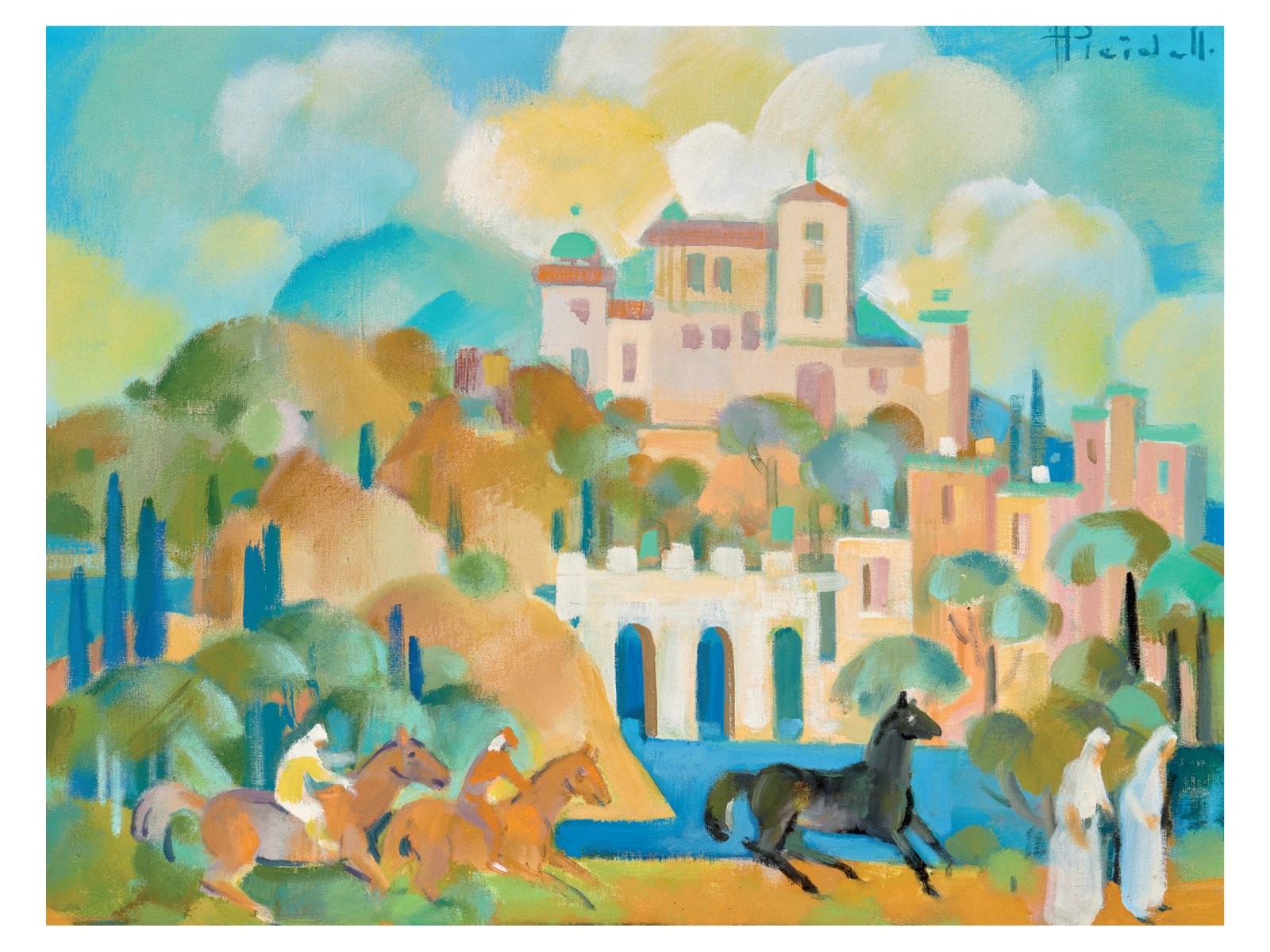 Pleidell János (Honfüzesgyarmat, 1915 – Dunaújváros, 2007) Mediterrán táj lovasokkal Olaj, vászon 60 X 80 cm Jelezve jobbra fent: Pleidell