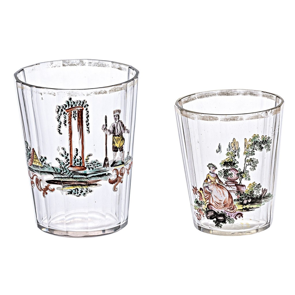 német, 18. sz. vége, csiszolt színtelen üveg, zománcfestett, aranyozott díszítéssel, aranyozás kopott, m: 9 cm és 7,5 cm