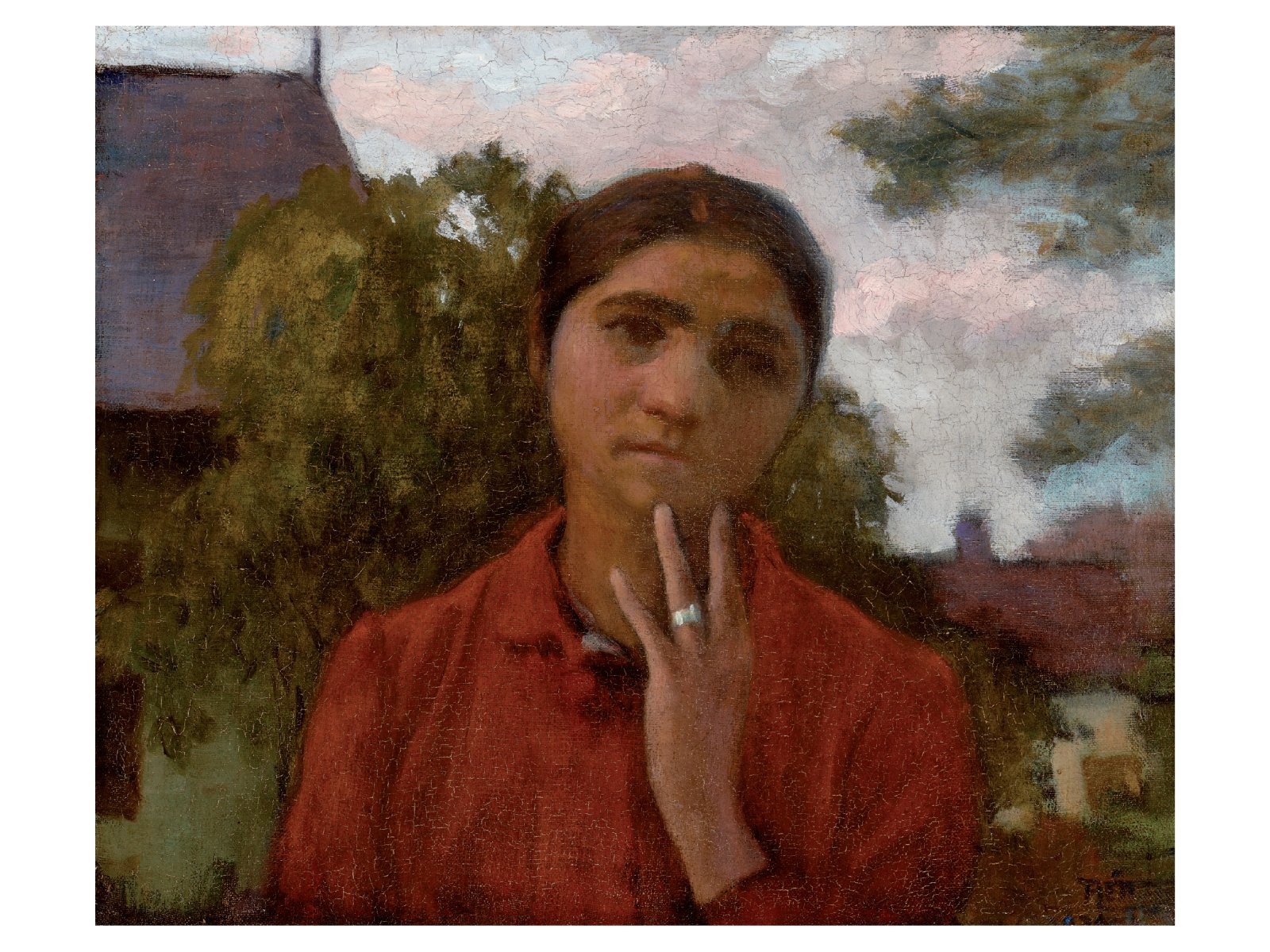 Réti István (Nagybánya, 1872 – Budapest, 1945) Piros ruhás nő, 1924, Nagybánya Olaj, vászon 51 X 60,5 cm Jelezve jobbra lent: Réti 924