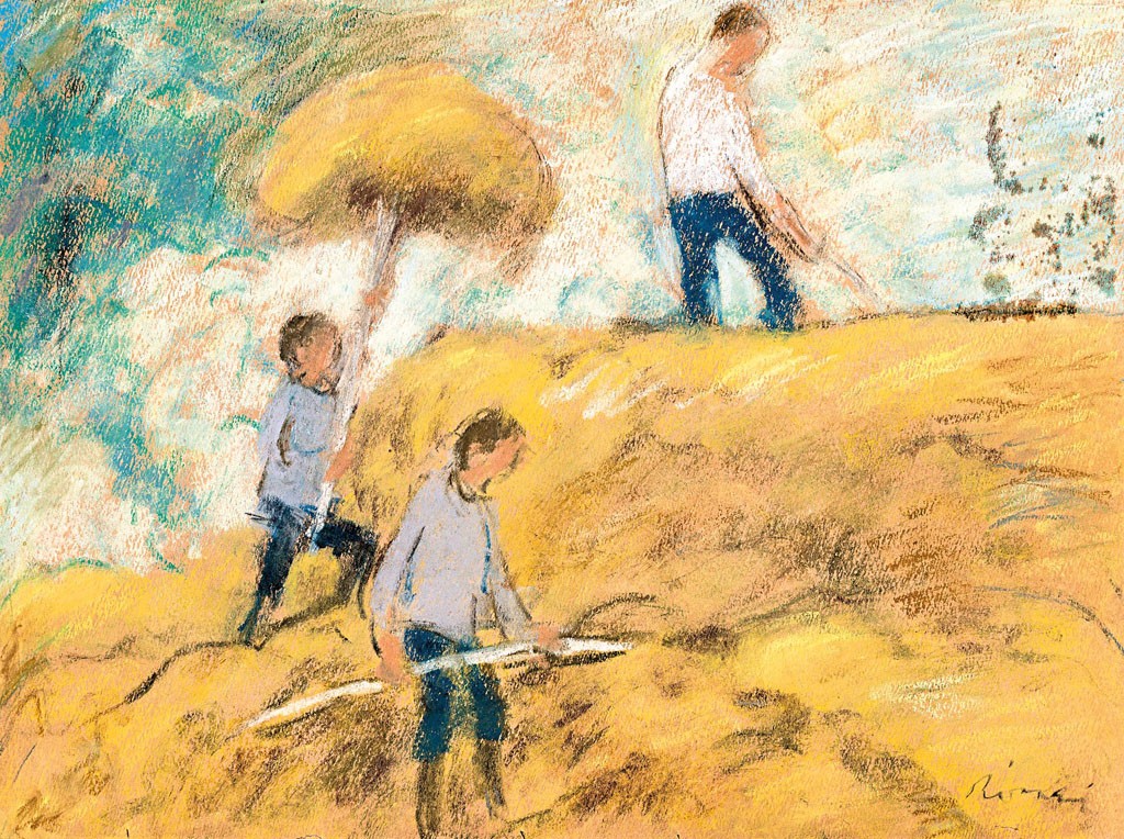 pasztell, papír, 26,5*36 cm, j.j.l.: Rónai; ho. autográf felirat: "Pista és a gyerekek rakják az asztagot 1920 szeptember hó 30. Rippl-Rónai", feltehetően kiállítva:Rippl-Rónai József gyűjteményes kiállítása,Budapest,Ernst Múzeum,1920 november (kat.17. As