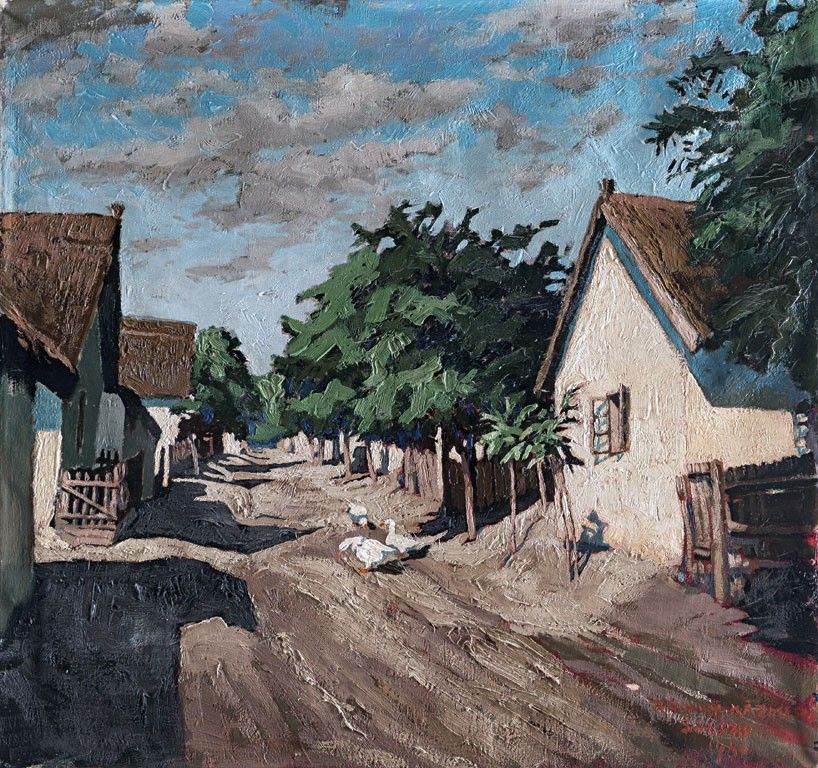 olaj, vászon, 64*69 cm, j.j.l.: Rónay Kázmér Sukoró 1946, ho.: Nemzeti Szalon kiállítási címke töredék