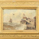 S. Erdőd (?) jelzéssel, XIX. sz. második fele: Vitorlás a holland partoknál. Olaj, vászon, sérült. Hátoldalán töredékes címkén német nyelvű felirattal. Dekoratív, sérült fakeretben. 18×29 cm