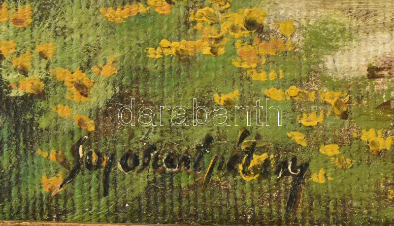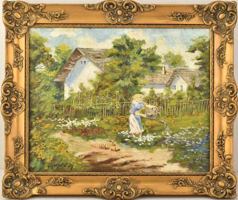 Sajószentpétery jelzéssel: Locsoló lány. Olaj, vászon, dekoratív fakeretben. 40×50 cm<a href="https://www.darabanth.com/hu/gyorsarveres/435/kategoriak~Festmenyek-es-grafikak/Festmenyek-es-grafikak-jelzessel-jelzes-nelkul~500002/Sajoszentpetery-jelze