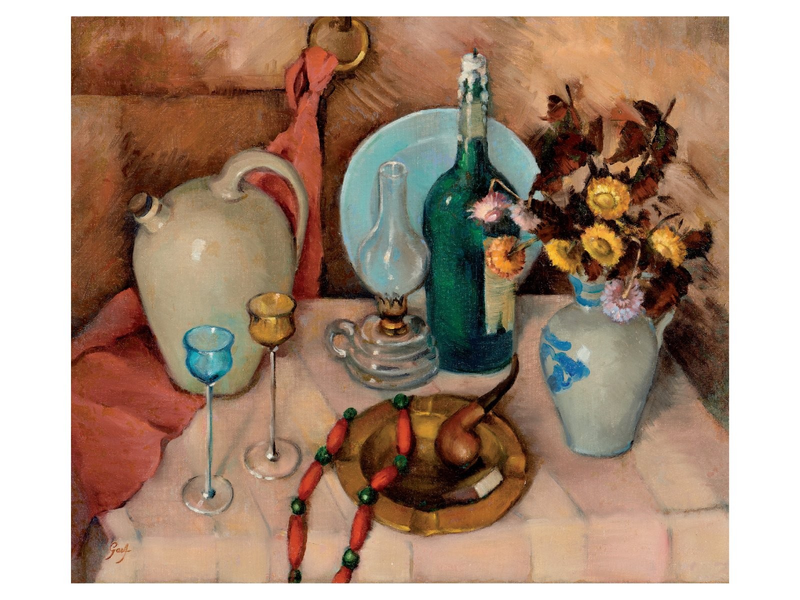 Salomon Garf (Amszterdam, 1873 – Auschwitz, 1943) Asztali csendélet Olaj, vászon 60,5 X 70,5 cm Jelezve balra lent: Garf