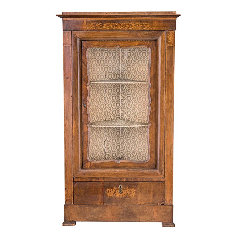 magyar, 19. sz. vége, fenyőfa alapon diófa borítással, jávorfa intarziával, alul egy fiókkal, 1 db kulccsal, sérült, 175*98*50,5 cm