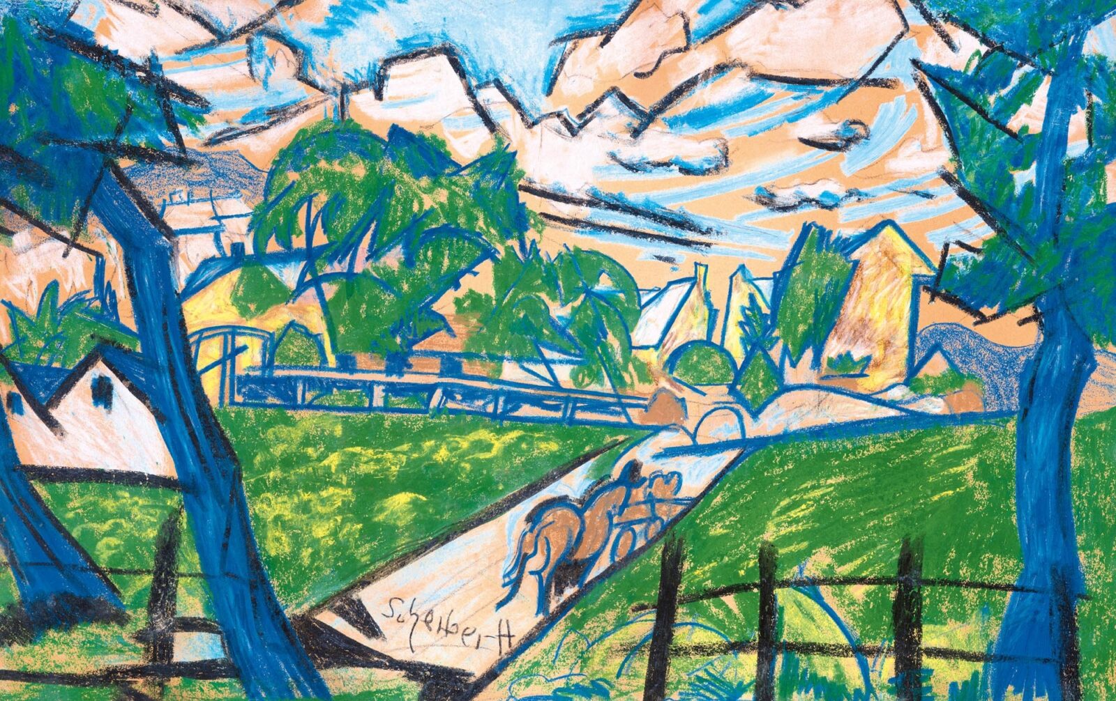 Scheiber Hugó: Kék táj lovaskocsival, híddal, 1920-as évek második fele