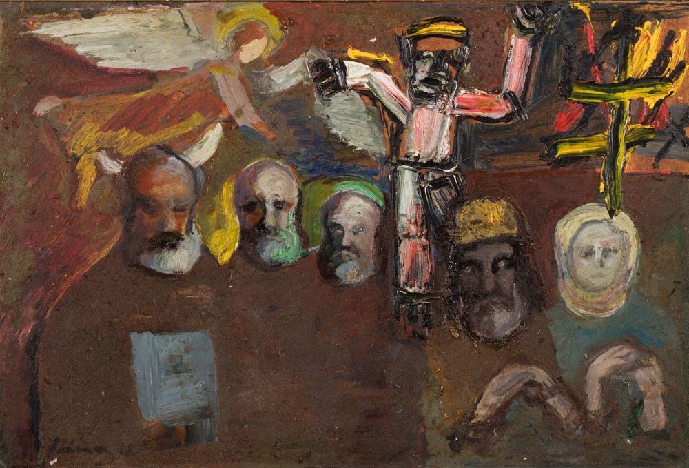 Schéner Mihály (Medgyesegyháza, 1920 – Budapest, 2009) SZENT ISTVÁN NÉPE Olaj, farost 40 × 60 cm Jelezve balra lent: Schéner