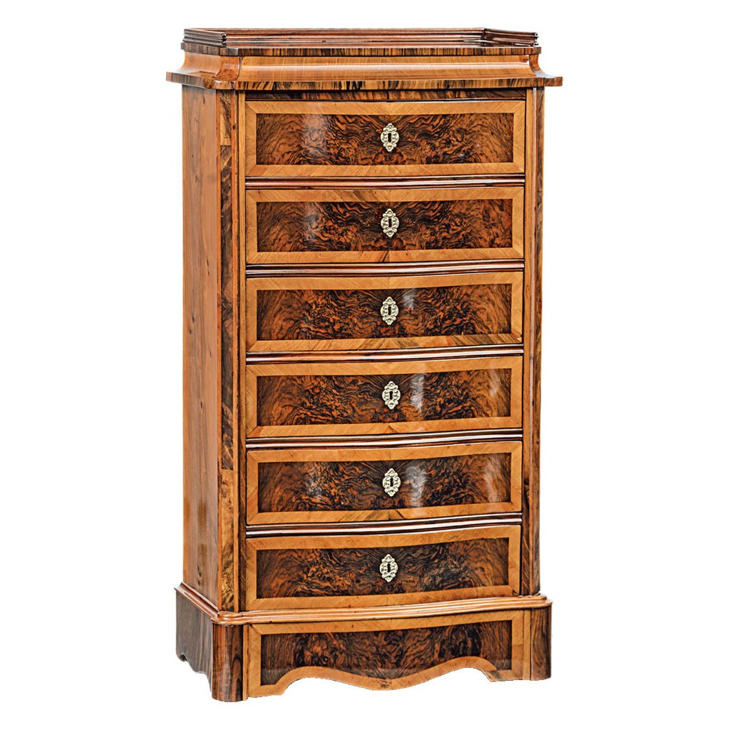 magyar, 19. sz. vége, fenyőfa alapon diófa és diógyökér borítással, öntött sárgaréz veretekkel, 6 db kulccsal, felújított, 127*71*36 cm