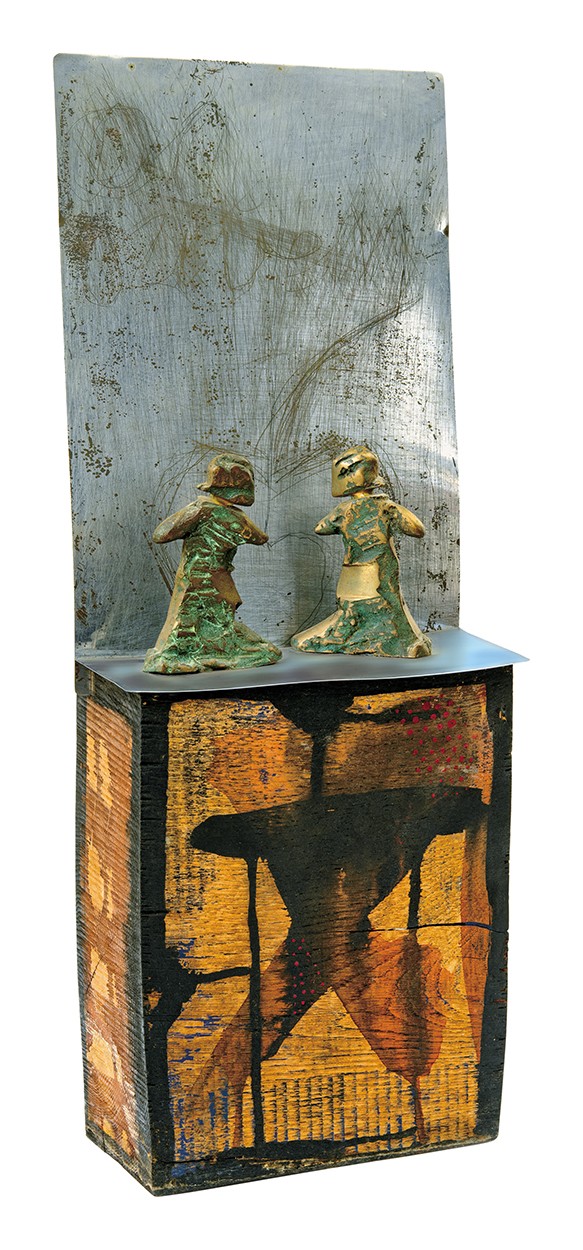 Sárgaréz, alumíníum lemez, olaj, fa,, 52 x 10,5 x 20 cm, Jelezve hátoldalon: Szívszorító-jel szállásnál. Stujber Zsuzsának szeretettel: S.R. 79. október. 25-én