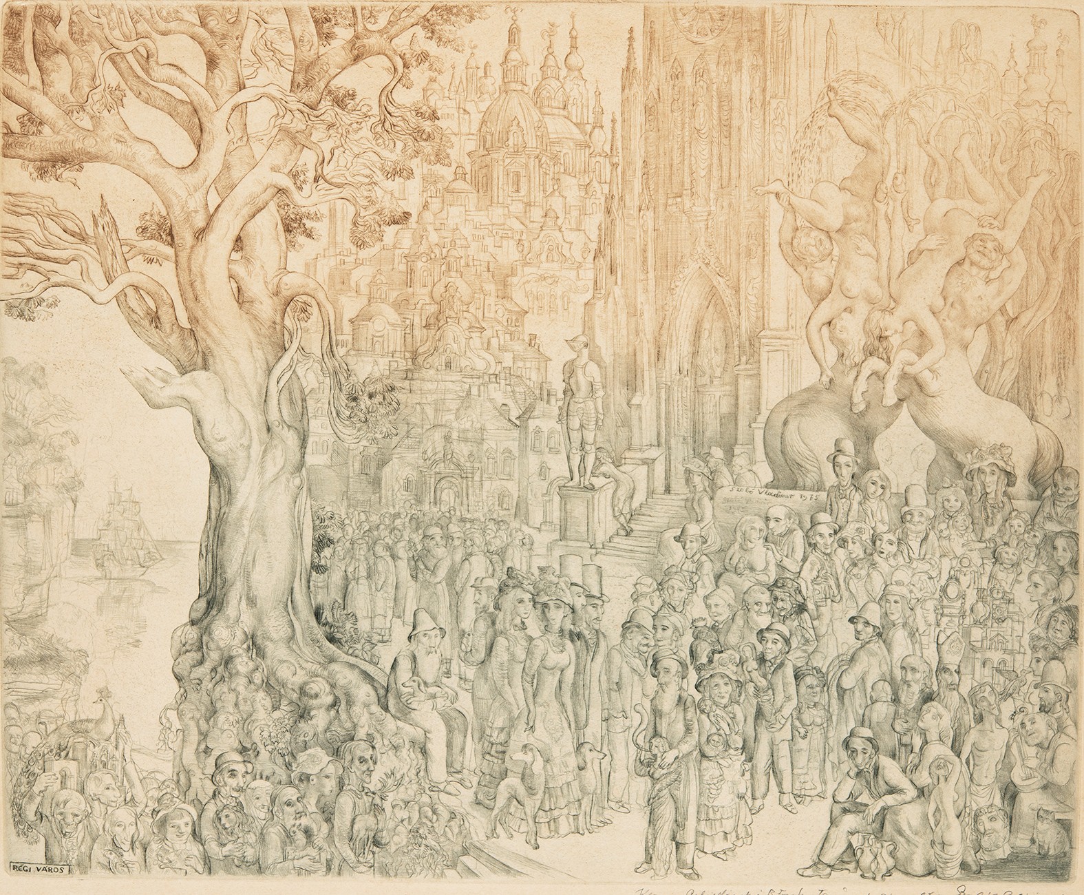 Színes rézkarc, papír, 49 x 59 cm, Jelezve jobbra középen: Szabó Vladimir 1975; Jelezve jobbra lent: Szabó Vladimir 1976 Kernács Gabriellának és B Farkas Tamásnak szíves emlékül; Jelezve balra lent: Régi Város