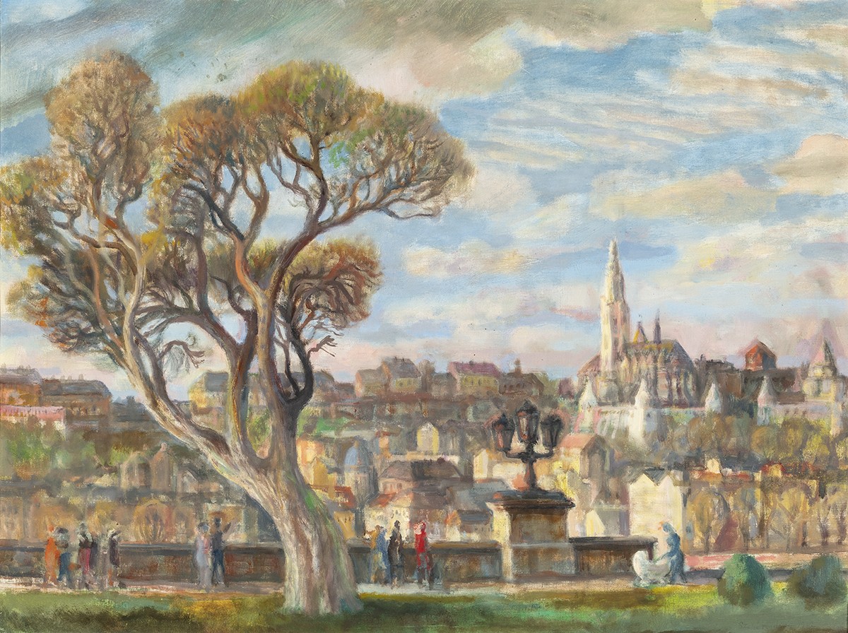 Szabó Vladimir (Balassagyarmat, 1905 – Budapest, 1991) Roosevelt tér Olaj, vászon 60 × 80 cm Jelezve jobbra lent: Szabó Vladimir Hátoldalon Képcsarnoki etikett