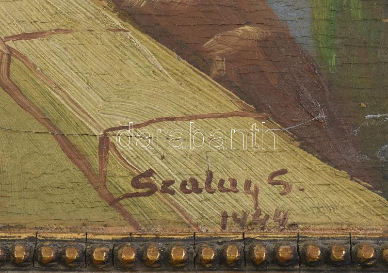 Szalai S. jelzéssel: Mediterrán táj. Olaj, rétegelt falemez, sérült keretben, 33×43 cm