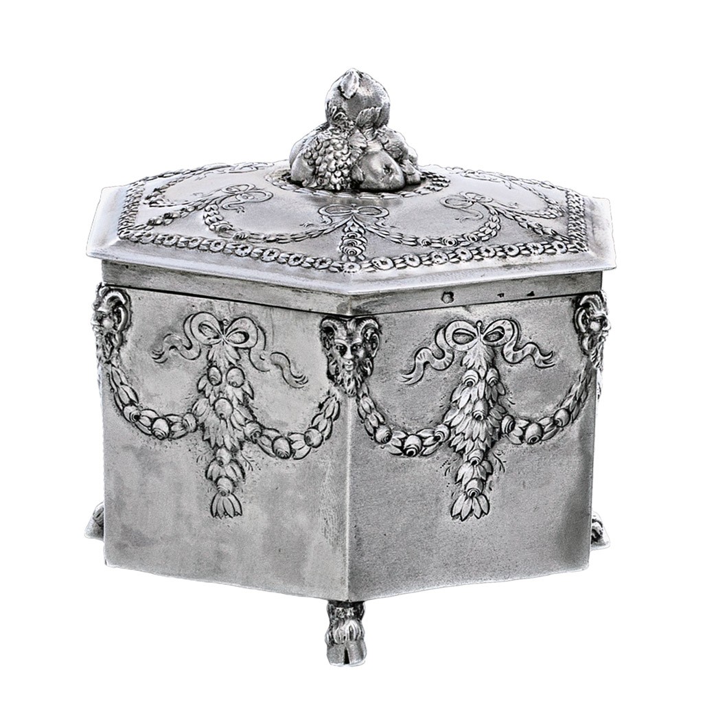 Bécs, 1872-1922 közötti fémjel, 800 ezrelékes ezüst, Eduard Friedmann mesterjegy, négy öntött lábon ívelt falú téglatest, domborított, poncolt díszében babérfüzérekkel, zárszerkezet kulcs nélkül, Btto.: 493 g; 15*13,5*10,5 cm