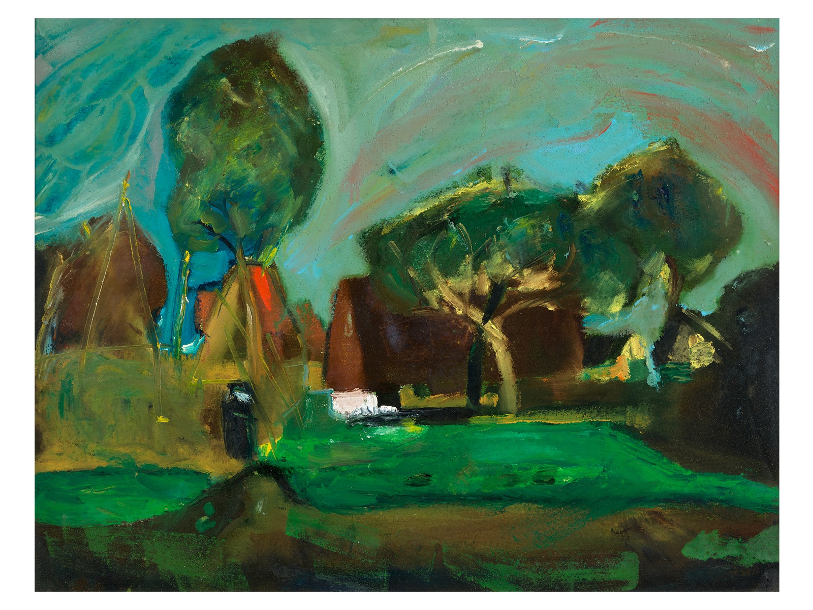 Szécsi András (Bukarest, 1934 – Marosvásárhely, 1991) Erdélyi tanya Olaj, farost 47,5 × 61,5 cm Jelzés nélkül