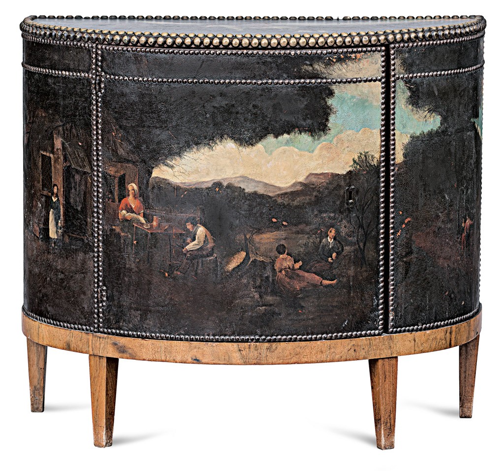 német, 19. sz., fenyőfa alapon diófa borítással, oldalán és tetején festett bőr borítással, sárgaréz szegecsekkel, eredeti zárszerkezettel, kulcs nélkül, kis sérüléssel, 90*101*51 cm