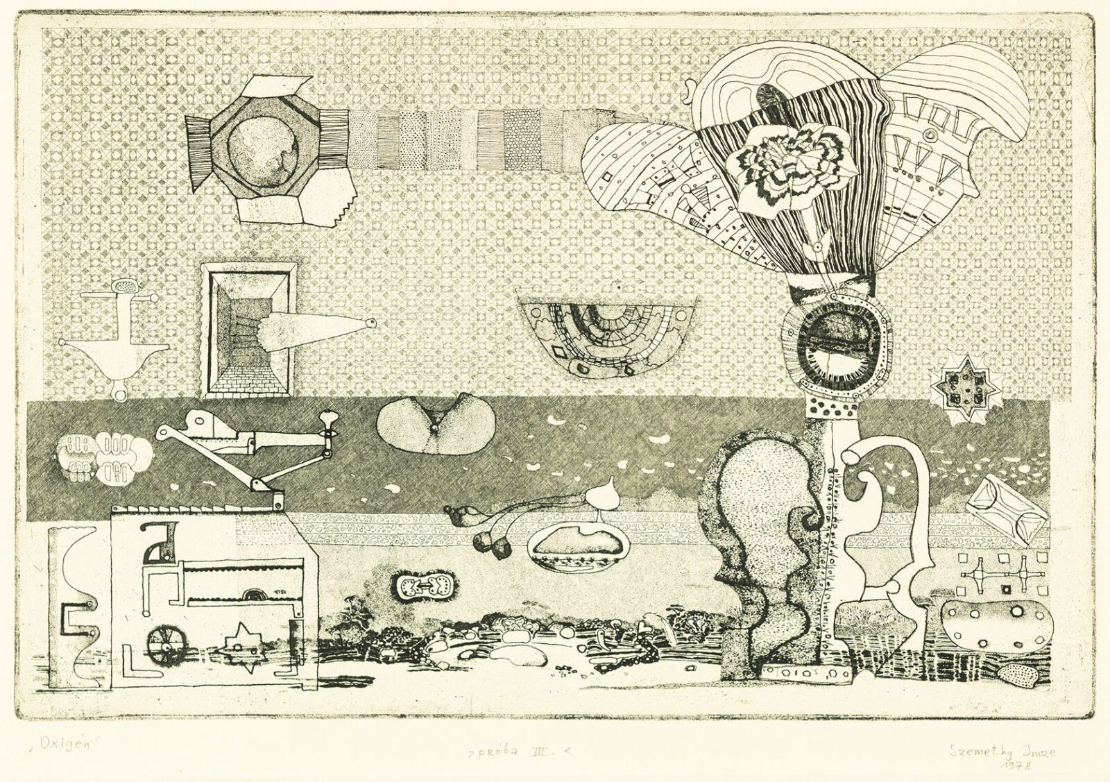 Rézkarc, papír, 195 x 295 mm, Jelezve balra lent: ‘Oxigén’; jelezve középen lent: >próba III.<; jelezve jobbra lent: Szemethy Imre 1978