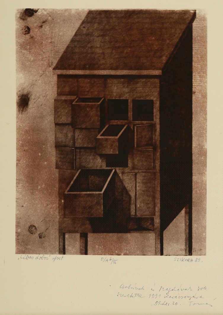 Szikora Tamás (1943 – 2012): "Lábas doboz" 1989 (ajánlás Sík Csabának 1991-ből)