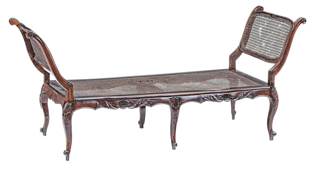 magyar, 18. sz., tömör diófa, faragott díszítéssel, nádazott ülőrésze sérült, felújított, 178*79*63 cm