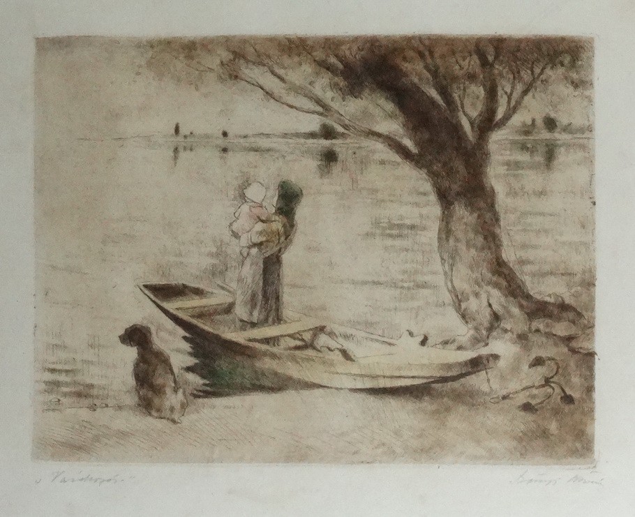 szinezett rézkarc, jjl., keretben, 23 x 30 cm